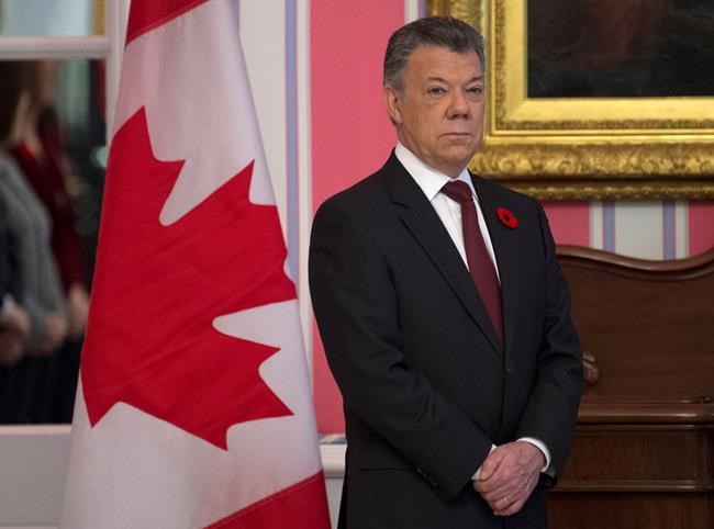 OTTAWA — Le président colombien lauréat d’un Nobel de la paix a remercié les Canadiens, lundi, pour leur soutien au processus de paix dans son pays — un soutien qui