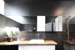 À la demande des propriétaires, qui aspiraient à un environnement plus convivial, les architectes se sont d’abord employés à décloisonner la cuisine, la salle à manger et le salon. La salle de bain a elle aussi été entièrement refaite. «Comme cette pièce ne possède aucune fenêtre vers l’extérieur et que nous voulions l’habiller de noir, nous craignions que le résultat ne soit très sombre. Heureusement, il y a un puits de lumière situé juste à côté, ce qui nous a donné l’idée de créer une ouverture vitrée dans le haut des murs», explique François Martineau. Les rayons qui entrent ainsi dans la salle de bain se reflètent dans le miroir et la céramique lustrée, de telle sorte qu’il n’est pas nécessaire d’allumer les luminaires durant le jour. «Les ouvertures vitrées donnent également un aspect sensuel, voire un brin voyeur, à la pièce», ajoute Jean-François St-Onge.