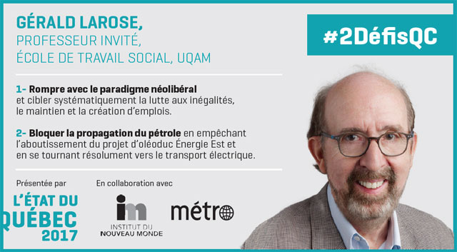 En collaboration avec le journal Métro, l’Institut du nouveau monde (INM) lance les #2défisQC. Dans L’état du Québec 2017, plusieurs personnalités ont été invitées à présenter les deux défis qui,
