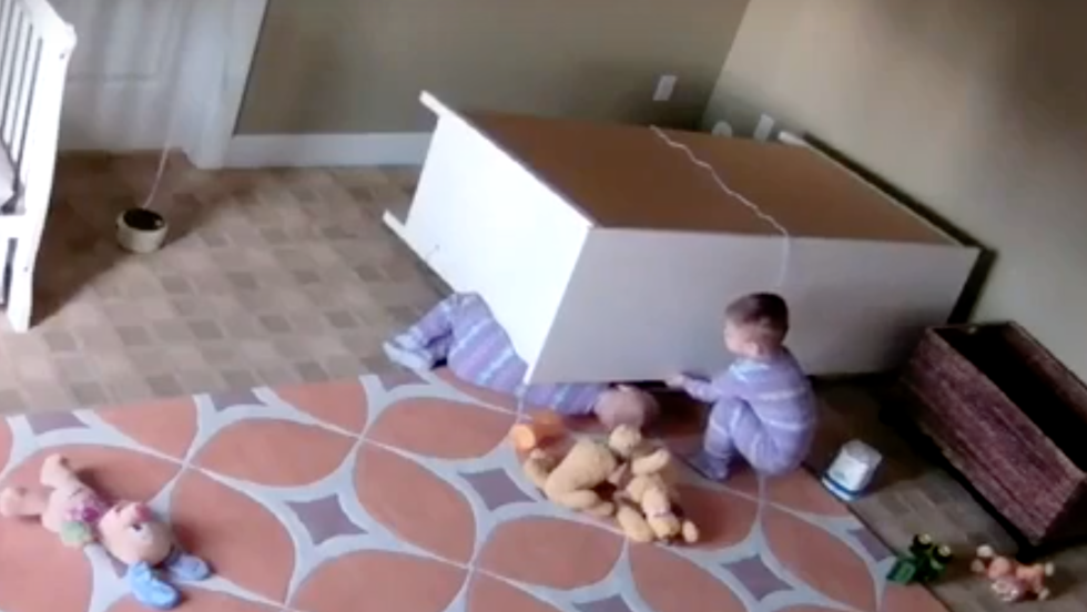 Un enfant de deux ans a extirpé son frère jumeau qui était pris sous une commode, montre une vidéo publiée dimanche sur les réseaux sociaux. Bowdy et Brock Shoff, vivant