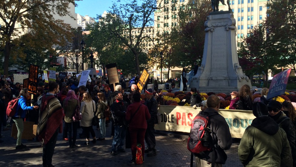 Plusieurs dizaines de personnes se sont réunies au centre-ville de Montréal, samedi, pour manifester contre les projets d’oléoducs et l’expansion de l’industrie des sables bitumineux au Canada. «On est ici