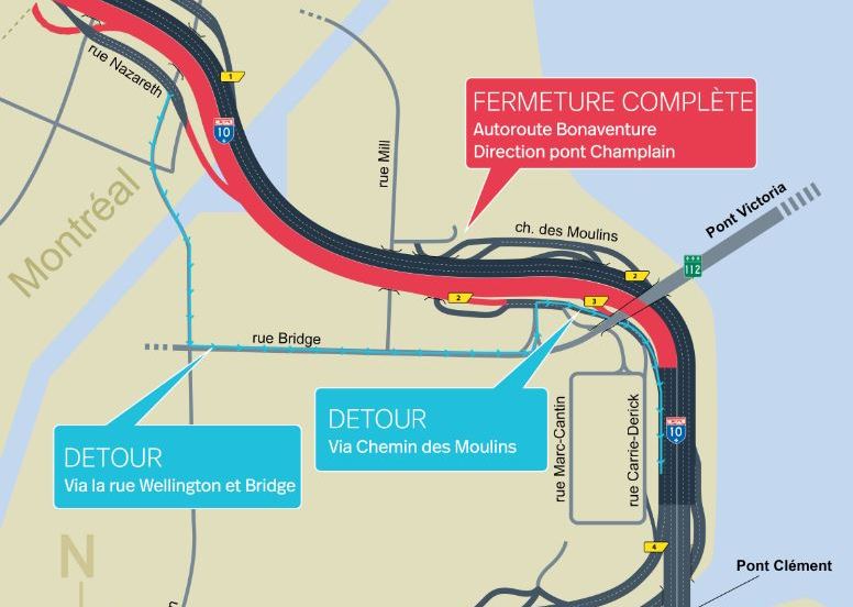 Des travaux sur les infrastructures de signalisation entraîneront la fermeture complète de l’autoroute Bonaventure en direction du pont Champlain, de 22h à 5h. Le corridor sera fermé entre la bretelle