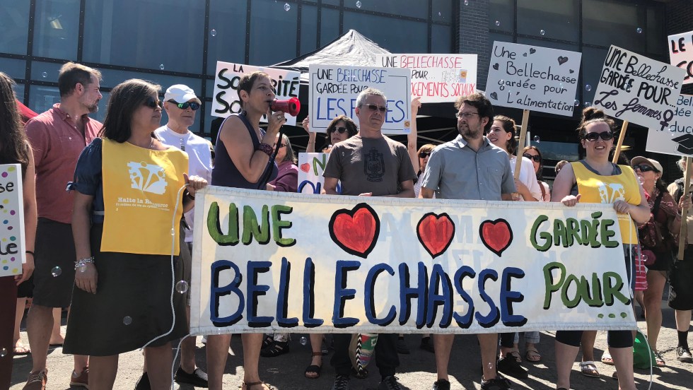Citoyens, représentants d’organismes communautaires, artistes et élus étaient rassemblés devant la station de métro Rosemont le 3 juillet pour réclamer la création de logements sociaux dans le quartier. Le secteur