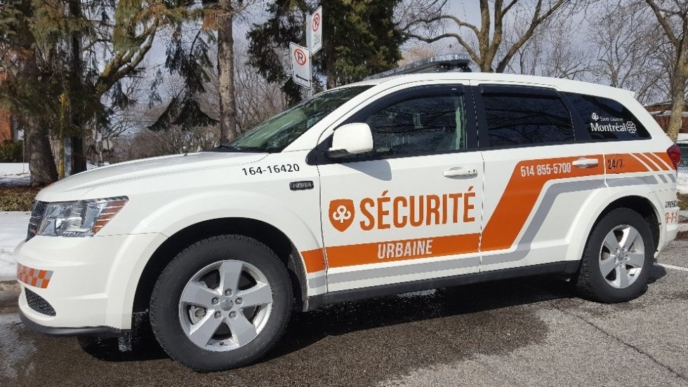 The patrol car in the parking lot of the Saint-Laurent borough hall is not a city police car; it’s part of the urban security patrol. Established in 2007, it collaborates