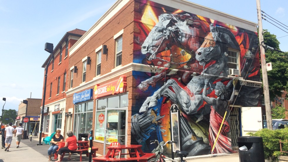 Juste en face de la place Rodolphe-Rousseau, l’artiste Dodo Ose de AShop Studio vient de terminer une murale sur un des murs du restaurant Décarie Hot Dog. Représentant Pégase et