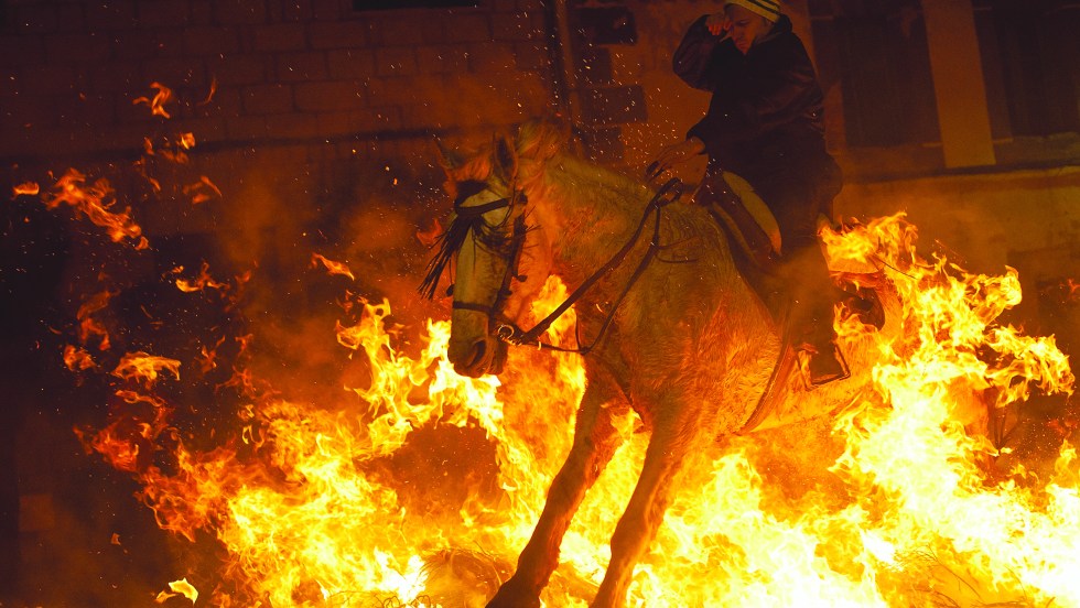 Un homme à cheval saute au-dessus d’un feu pendant une cérémonie religieuse controversée dans le village espagnol de San Bartolomé de Pinares, à 100km nord-ouest de Madrid. Environ 100 cavaliers