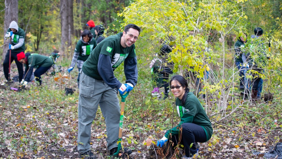 Dans le but de revitaliser le boisé du parc Marcel-Laurin à Saint-Laurent, 30 bénévoles et employés de la Banque TD ont planté 150 arbres lors de la Journée des arbres,