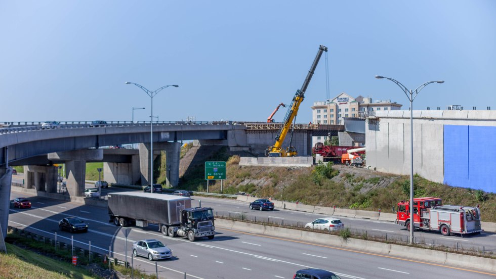 Les automobilistes pourront d’ici les prochains mois emprunter les liens directs entre l’aéroport de Montréal et l’autoroute 20, à Dorval. L’installation des poutres métalliques des deux ponts est maintenant complétée.