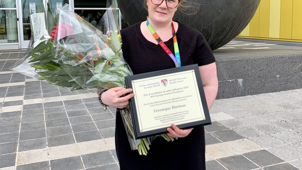 L’infirmière auxiliaire Véronique Hurteau a reçu le Prix d’excellence Isobel MacLeod pour son dévouement et son travail d’exception à l’Hôpital de Montréal pour enfants du Centre universitaire de santé McGill
