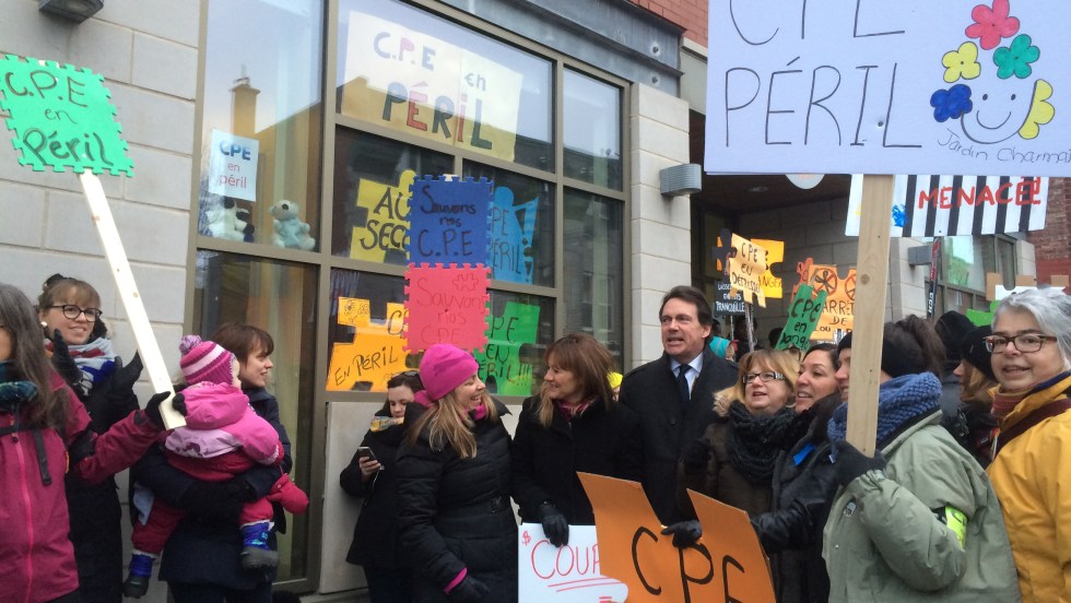 Une trentaine de parents, enfants, éducatrices des centres de la petite enfance (CPE) du quartier se sont joints au mouvement de protestation contre les compressions de 120 M$ annoncées par