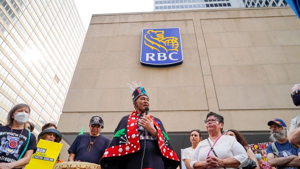 Un rassemblement en soutien à la communauté Wet'suwet'en s'est tenu devant les locaux de la Banque Royale du Canada (RBC) à Montréal pour demander à celle-ci de cesser son financement massif des projets de pipelines TransMountain (TMX) et de gazoduc