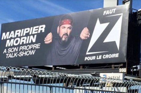 Sur le grand panneau publicitaire installé en bord de route à Montréal, on y annonce que «Maripier Morin a son propre talk-show», mais son visage a été remplacé par celui d’un homme barbu. Le slogan de Z étant «Faut Z pour le croire».