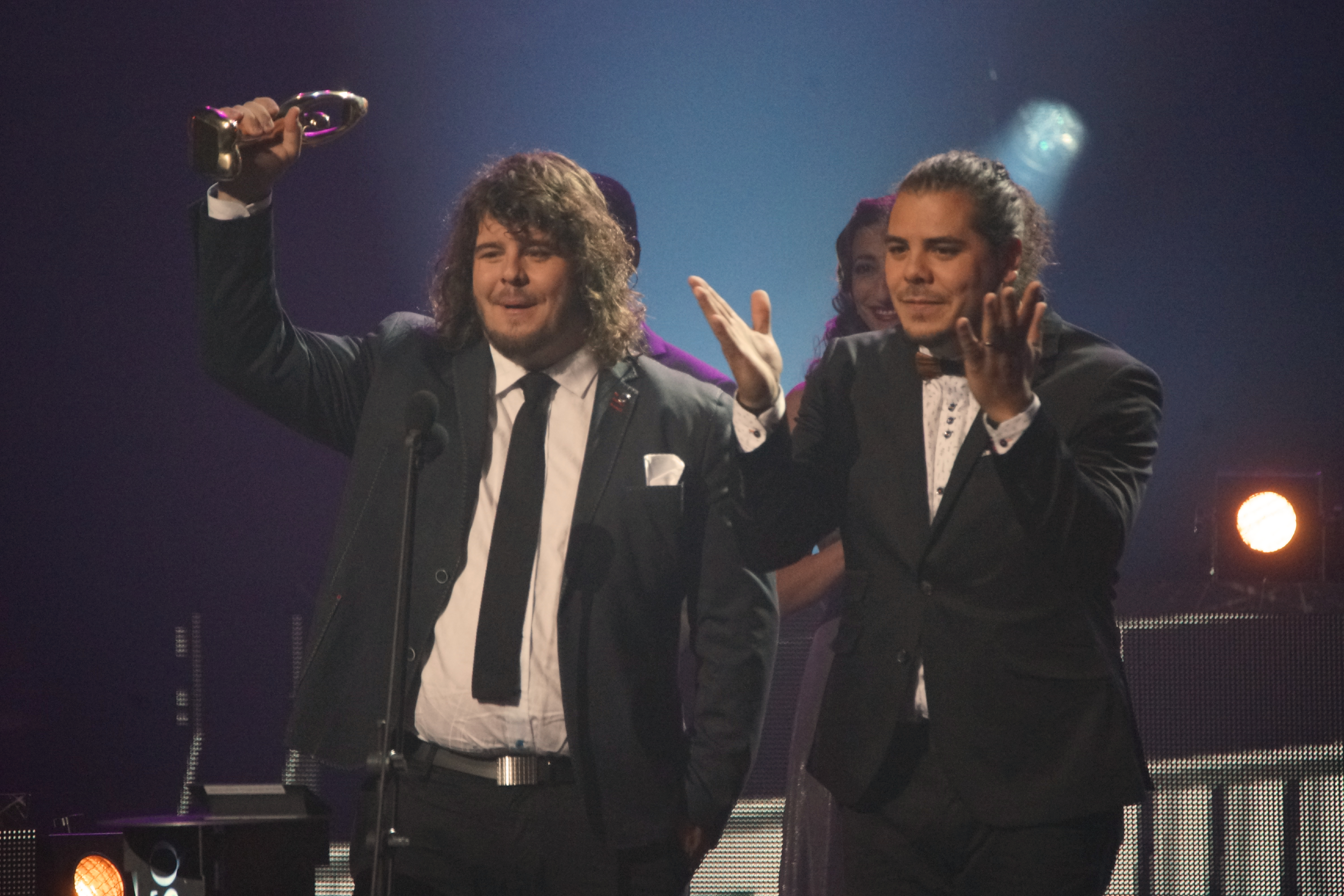Du côté des présentations, Marie-Mai, qui a fini la soirée avec un trophée d’interprète féminine de l’année (son cinquième en carrière), est arrivée pour présenter l’album pop en lançant : «Je suis vraiment contente. ON est vraiment contentes d’être ici.» (Nuance faisant référence à sa petite fille à naître.) Puis, elle a enchaîné avec un «Le, la ou LES gagnants est ou sont». Elle a bien fait de le préciser, car ledit prix est allé non pas à un des quatre artistes solo en nomination, dont Laurence Nerbonne et Philémon Cimon, mais bien aux 2Frères mentionnés en intro. À savoir Erik et Sonny Caouette, frangins musiciens originaires de Chapais, qui ont obtenu un grand succès, notamment sur les ondes, avec leur premier album studio éponyme. Visiblement émus, les gars, qui sont également repartis avec le titre de groupe de l’année, ont salué leurs parents qui ne leur ont jamais dit de se «trouver une vraie job!»