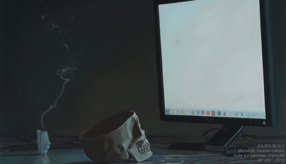 Mêlant les disciplines, la commissaire a également incorporé dans l’expo une toile de l’artiste saguenéen Julien Boily, Memento Vastum. Son sujet? «Une mémoire disparue, la perte des savoirs au profit d’informations ou de données, l’obsolescence programmée.» En bref: «Un tableau qui dépeint l’internet comme une vanité contemporaine.»