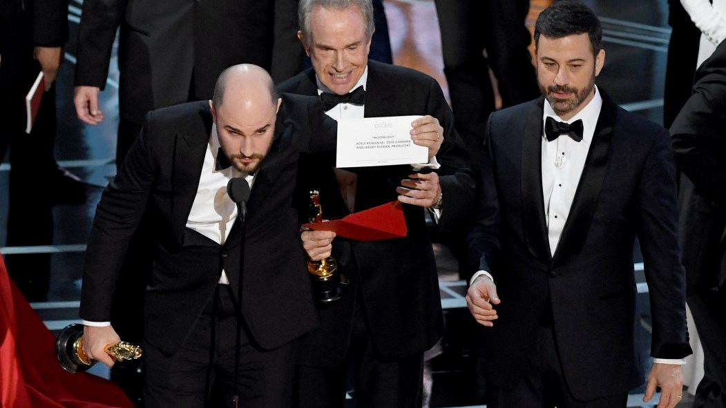 Personne ne comprenait plus rien, c’était le bordel dans la salle. Pendant que les artisans de La La Land s’éloignaient du micro et reculaient vers le fond de la scène, ceux de Moonlight s’avançaient, le réalisateur Barry Jenkins en tête, la main sur la bouche et les yeux exorbités, vers le lieu occupé quelques secondes plus tôt par une autre équipe. Pendant un instant, on a pensé que ouh, la classe, la bande de la comédie musicale faisait son Adele aux Grammy – à savoir, remettait son prix à un concurrent qu’elle jugeait plus méritant. Mais non, semblerait simplement que Warren Beatty et Faye Dunaway, les présentateurs dudit prix, aient mal lu la carte («Warren, qu’as-tu fait là!» s’est écrié, mi-figue mi-raisin, Jimmy Kimmel.)
