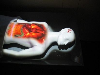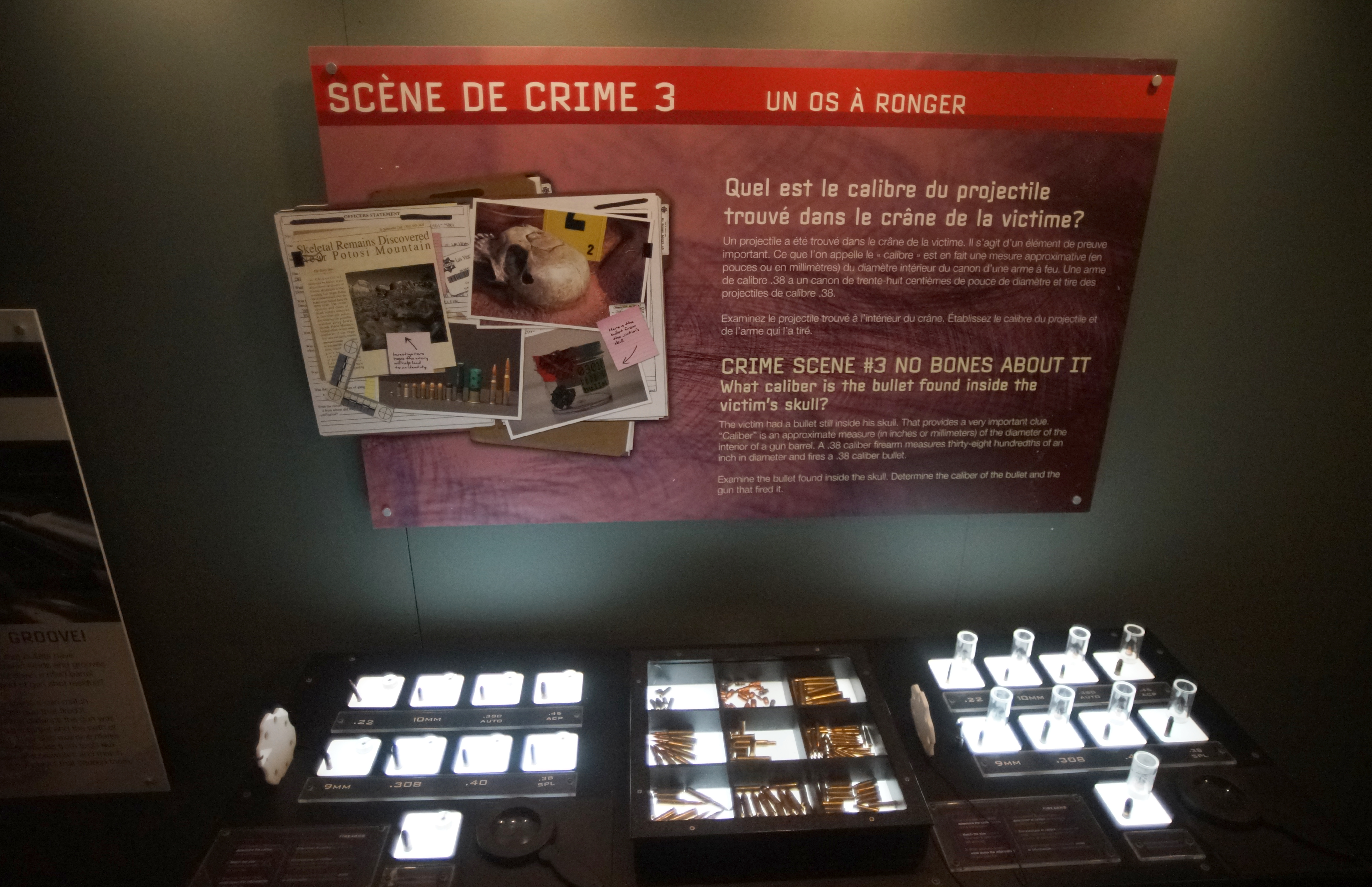 Première étape de la visite: la scène de crime. Il y en a trois: un salon où se trouve une voiture qui a défoncé un mur, avec un homme mort au volant; une ruelle lugubre où le corps d’une travailleuse de motel gît sur le sol; un désert où se trouvent des ossements humains. Chacune des scènes est réaliste, sans être trop troublante (l’exposition est cependant déconseillée aux enfants de 12 ans et moins). Les enquêteurs du dimanche sont invités à observer tous les éléments qui sortent de l’ordinaire pour ensuite les analyser au laboratoire.