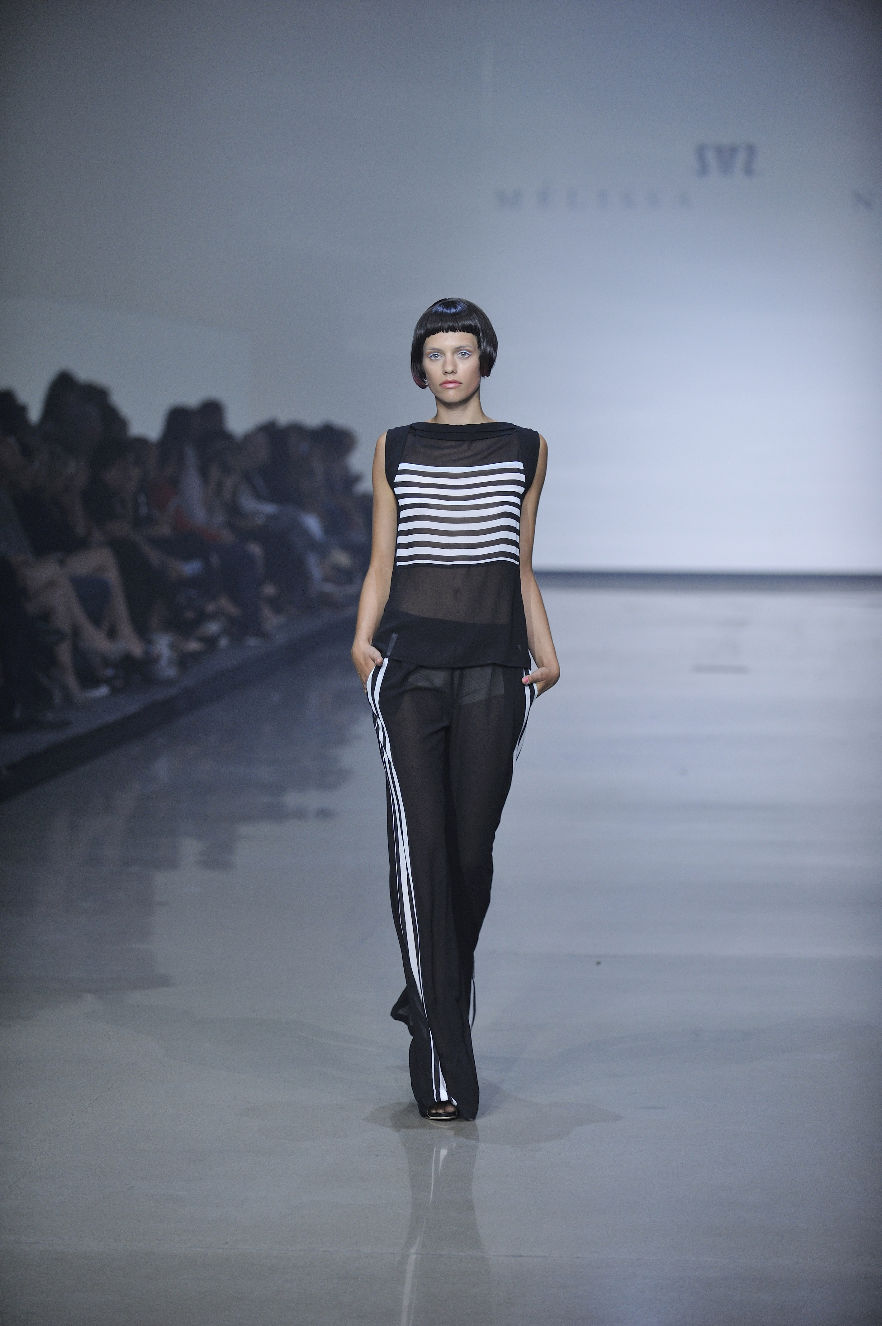 Faisant un clin d’œil bien à elle au look marin, Mélissa Nepton a présenté plusieurs pièces où la ligne verticale domine. On ne l’a par contre pas retrouvée dans des gilets de matelots à la Jean Paul Gaultier, mais plutôt dans de nouvelles façons de les travailler, en motif sur un chandail, sur une robe de coton ou sur le devant d’un pantalon de soie.
