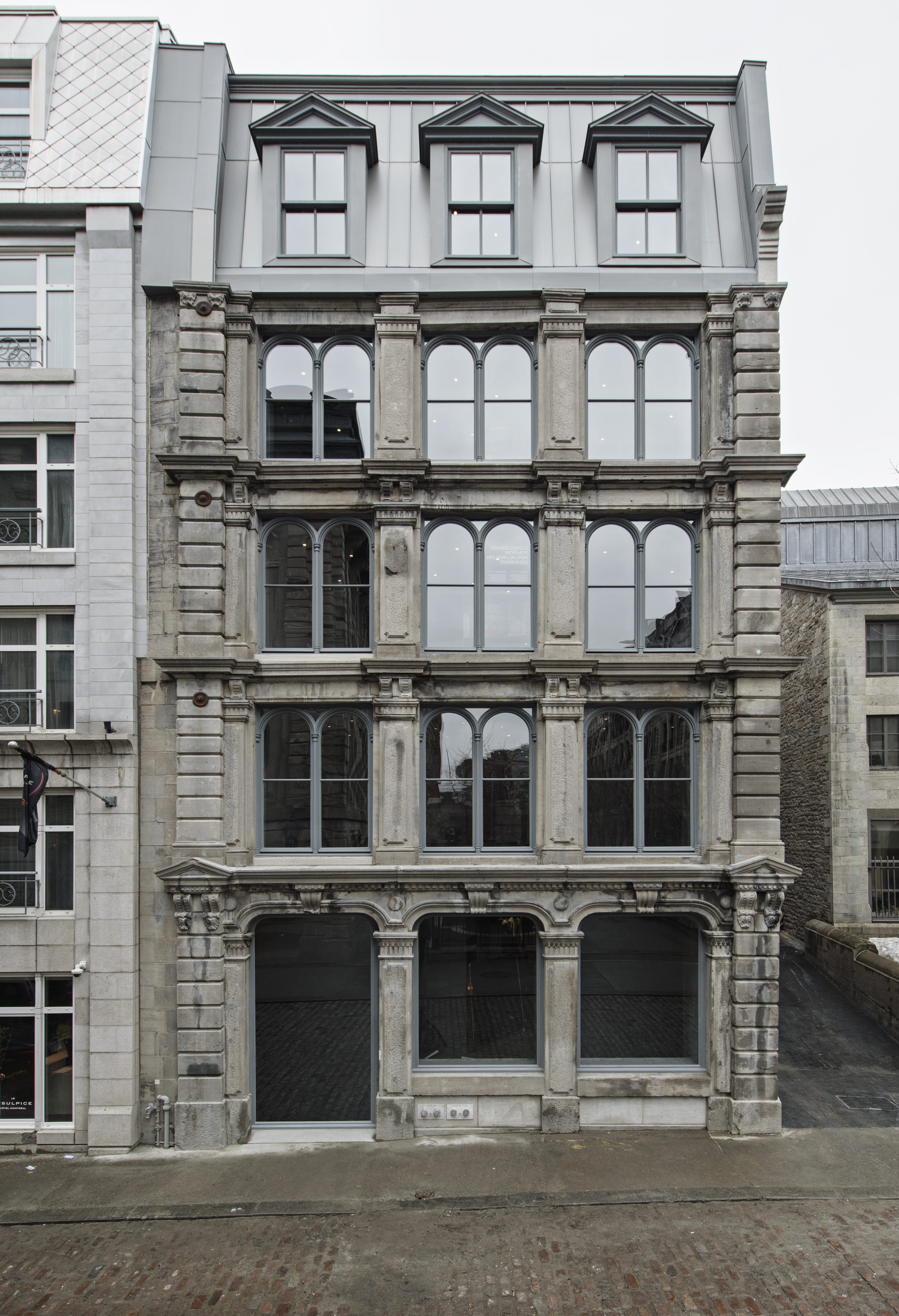 David Chipperfield a conçu «un édifice dans un édifice» en préservant la façade du 418, Saint-Sulpice et en y intégrant une nouvelle structure «flexible», qui peut être modulée à l’envi. «L’espace devait être facilement transformable pour offrir la flexibilité de créer et de mettre en valeur différents projets», explique en entrevue le cofondateur et directeur général de SSENSE, Rami Atallah. Des planchers aux plafonds, tout est couvert d’un béton gris foncé qui sert d’écrin neutre, mais toutefois moderne pour mettre en valeur les vêtements et autres installations artistiques. D’ailleurs, des œuvres contemporaines qui changeront régulièrement y seront exposées, à commencer par l’installation réalisée par le compositeur de musique électronique Arca la semaine dernière, dans le cadre de la soirée d’inauguration.