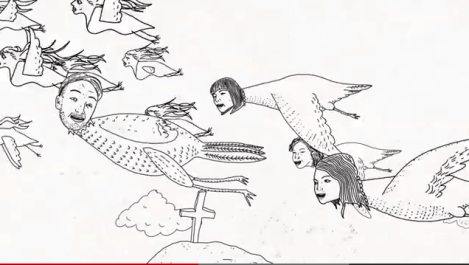 On y reconnaît le visage et l’incontournable casquette d’Adamus, mais sa tête est placée sur le corps d’un oiseau qui déambule dans un univers surréaliste qui a l’air d’un croisement entre l’univers des Monty Pyhton et les délires religieux de Hieronymus Bosch. Adamus semble parti pour la grande migration, vite suivi de ses choristes ainsi que d’une volée de tranches de pain ailées dans cette délirante et délicieuse aventure, qu’on reverra avec un plaisir renouvelé.