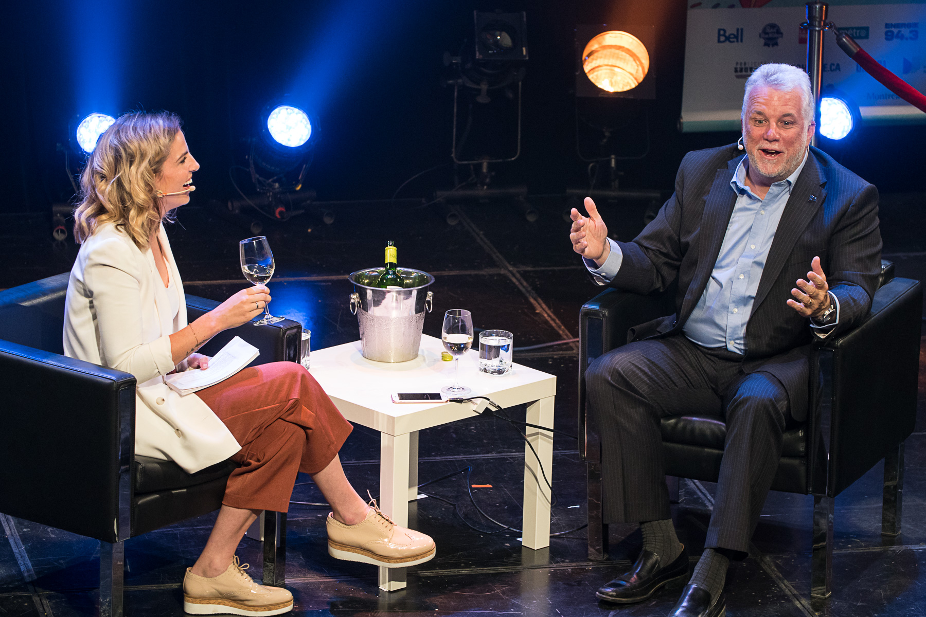 L’animatrice qui, de son propre avis, n’y connait rien à la politique ou à la pêche, au contraire de son invité, a décidé pour l’occasion de miser sur ses forces. Peu après avoir accueilli le «président du Québec» sur scène, la moitié du duo des Grandes Crues lui a servi un verre de vin. «C’est quand la dernière fois que vous avez été pompette?», a-t-elle demandé. Le ton était fixé.
