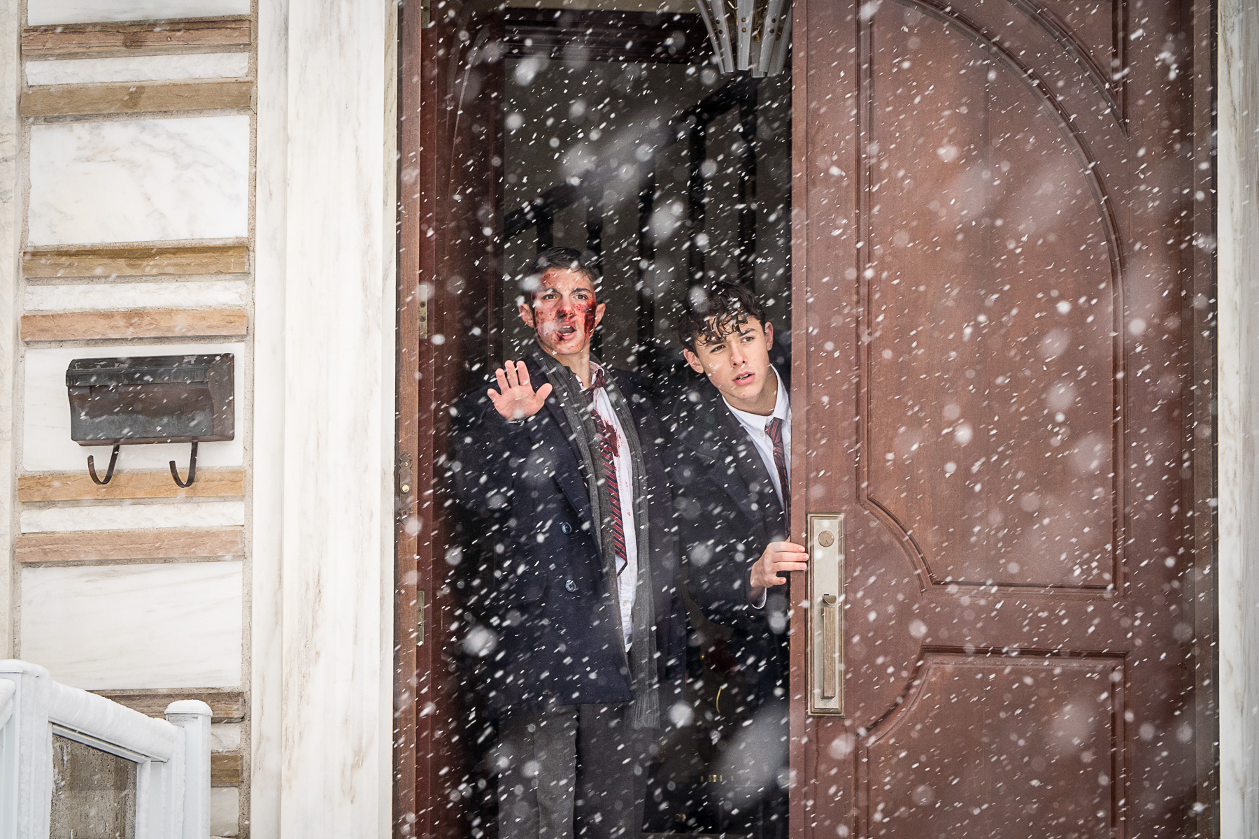 Saint-Léonard sous la neige. Deux jeunes hommes, dont l’un a le visage ensanglanté après avoir subi une raclée, se traînent dans la tempête vers une gigantesque résidence aux allures de manoir mafieux. Les automobiles d’époque dispersées dans la rue rappellent que l’action se déroule au début des années 1980.