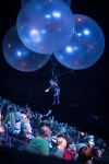 Les acrobates gravitent entre ciel et terre sur deux plateaux tournants, dans une configuration où le public se retrouve en tête-à-tête, une première dans l’histoire scénique du Cirque du Soleil. C’est que l’interaction avec le public occupe une place centrale dans plusieurs numéros, comme celui où une petite clownesse s’élance à la rencontre des spectateurs, portée par des ballons gonflés à l’hélium.