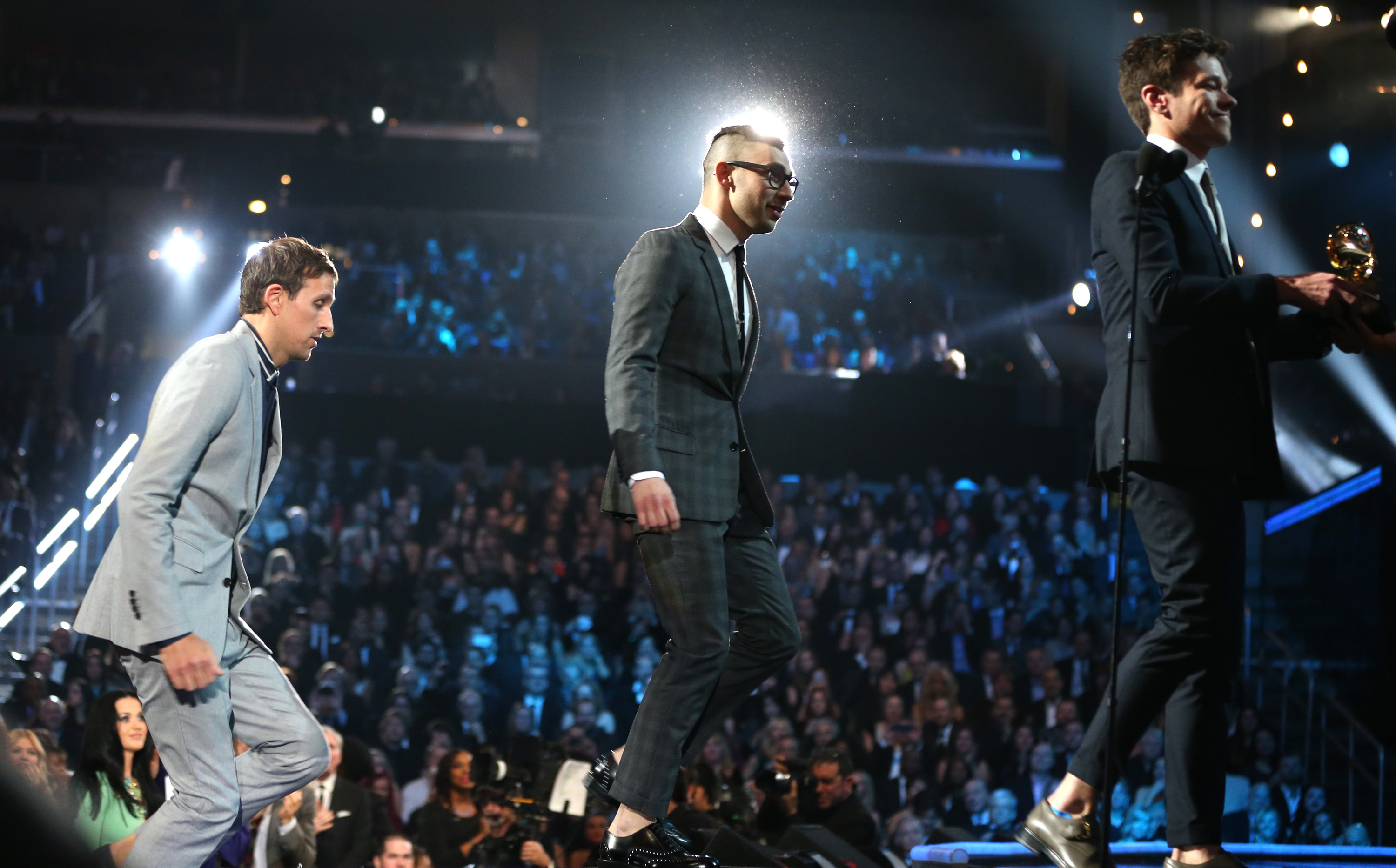 Assez ironiquement, c’est dans une robe pastel très révélatrice que Katy Perry a présenté le prix de la Révélation de l’année. Sa récompense «préférée». «Avis aux candidats en lice! Si vous ne gagnez pas, ce n’est pas grave. Moi, je n’ai jamais été nommée dans cette catégorie et j’ai ma propre marque de faux cils!» Ladite récompense est donc allée aux indie-popeurs de fun. Étrangement, en prenant le micro, le chanteur Nate Ruess, visiblement extatique de la tournure des événements, a tenu à souligner… à quel point il devait aller aux toilettes. Puis, c’est Prince (!) qui est venu présenter le prix du Meilleur enregistrement. «Ah. J’aime cette pièce», a-t-il affirmé stoïquement en ouvrant l’enveloppe et en lisant le titre de Somebody I Used to Know, l’omniprésent tube de Gotye (et Kimbra). «Merci à tous les gens qui écoutent de la musique!» a lancé le Belge en récupérant son gramophone.