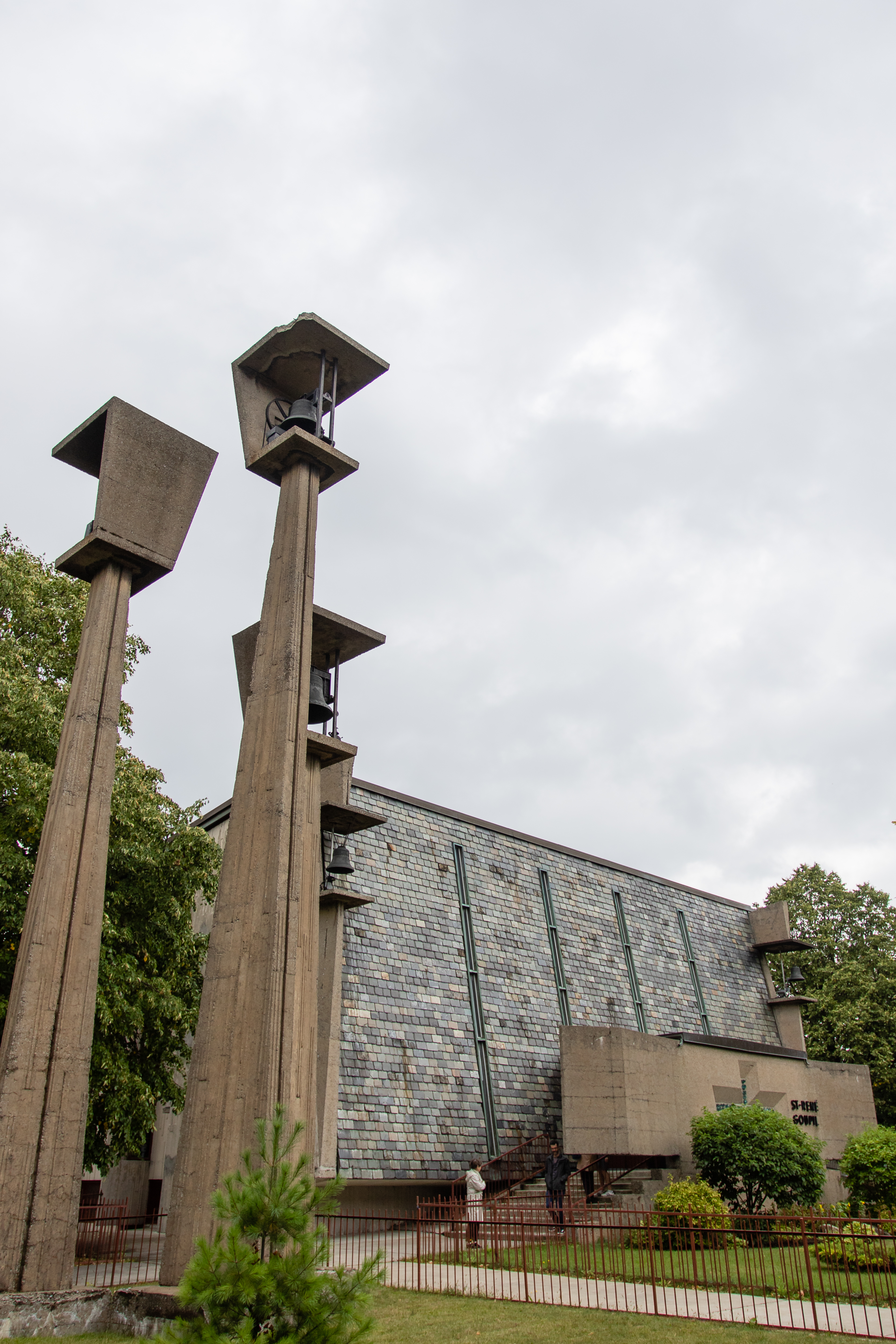 Discrètement installée dans une modeste rue résidentielle, la petite église étonne par son revêtement fait de béton et d’ardoise et ses trois clochers qui évoquent d’immenses lampadaires. De l’intérieur, qui mélange bois et brique, se dégage une impression de chaleur et d’intimité.