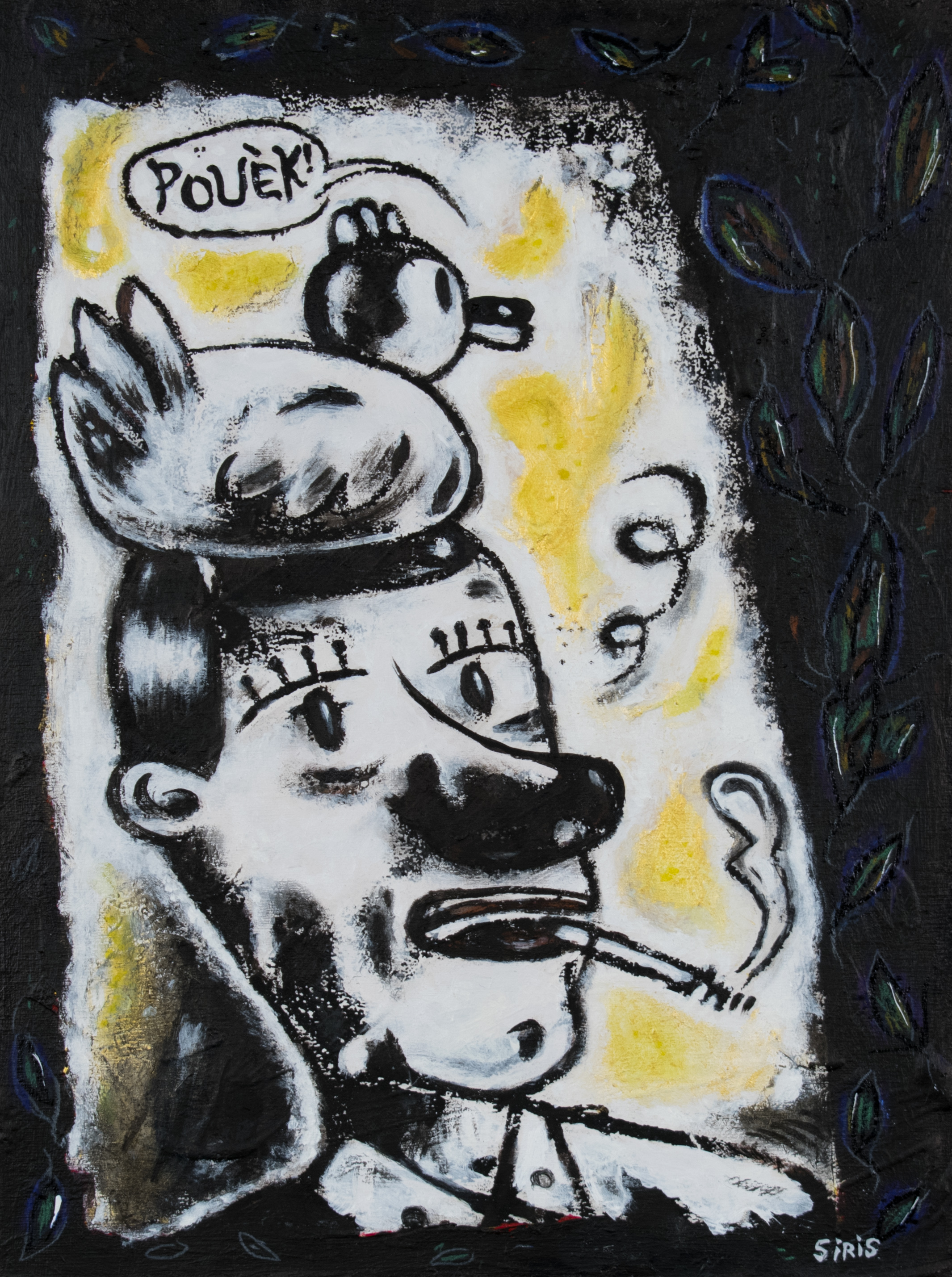 Nommé Dallaire a pondu un gallinacé, son tableau représente le peintre avec un oiseau sur la tête. «Dallaire a fait beaucoup de natures mortes montrant des poules et des coqs. Une de ses plus connues est Coq licorne. Ma peinture est un clin d’œil à son œuvre.»