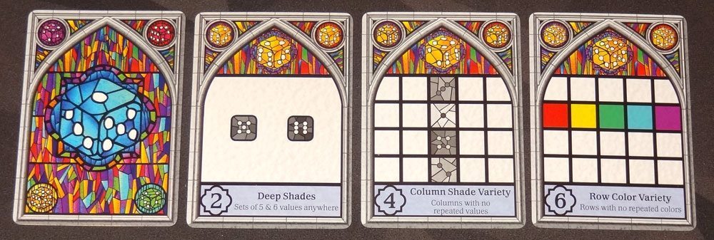 À chacune des 10 manches, on brasse des dés pigés au hasard dans un sac, et les joueurs en choisissent un à tour de rôle et le positionnent sur leur grille. Attention, celle-ci est unique à chaque joueur et ses espaces contiennent parfois des restrictions de couleurs ou de chiffre! Cette grille est en fait une carte que l’on insère dans notre plateau/vitrail, elle est donc interchangeable chaque partie.