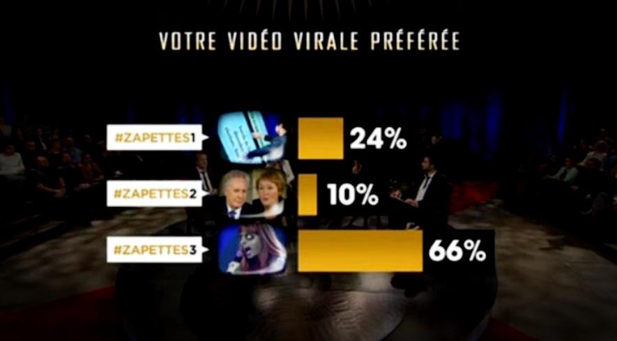 L’équipe de C’est juste de la tv a également eu une bonne idée pour profiter du direct : faire voter la catégorie du meilleur vidéo viral via leur fil Twitter. C’était simple, qu’à écrire le mot-clic #Zapette1 pour voter pour le premier extrait, #Zapette2 pour le 2e et ainsi de suite. C’était une intéressante utilisation du deuxième écran pour faire participer le public. J’aurais par contre pris plus d’une catégorie votée en direct, mais je comprends que les moyens techniques et le temps ont dû freiner cette ambition.