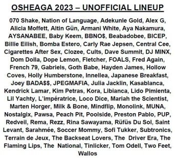 Fidèle à son habitude, Osheaga présenterait, si l’information s’avère exacte, des concerts pour tous les goûts encore cette année. On retrouve notamment dans la programmation les rappeurs Baby Keem, Joey BADA$$, JPEGMAFIA et Lil Yachty, la sensation électro Fred Again, les artistes indie Soccer Mommy ainsi que Dope Lemon. Mentionnons aussi en rafale L’impératrice, Sofi Tukker, Cigarettes After Sex, Libianca, Tom Odell et Two Feet, entre autres.