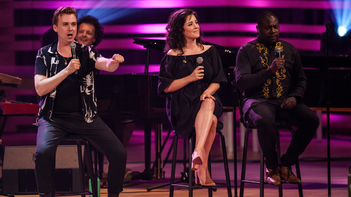 Et samedi soir, à la Maison symphonique de Montréal, toujours dans le cadre de Juste pour rire, un Grand Concert improvisé s’est créé devant nos yeux. C’est accompagné de sept musiciens de la troupe des Wonder-Trois-Quatre, qui a l’habitude de l’improvisation sur scène, d’un chef d’orchestre (le fantastique Éric Desranleau) et de LeLouis Courchesne à l’animation que le trio d’humoristes Arnaud Soly, Virginie Fortin et Richardson Zéphir a pris le pari d’improviser des chansons dont les thématiques venaient du public.