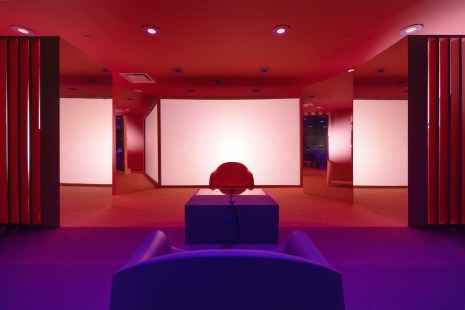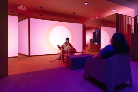 Dans une salle à l’éclairage tamisé, deux fauteuils se font face. Sur l’un, un.e comédien.ne portant des lunettes fumées attend les visiteur.euse.s. Sur l’autre, on peut s’asseoir et prendre le microphone sur la table devant soi pour interroger une intelligence artificielle (IA).