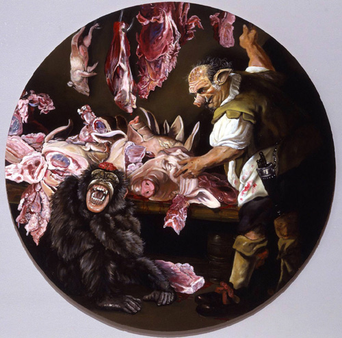 Joe Becker aime faire voyager ses personnages de toile en toile. Comme cette grande bestiole bleue que vous voyez à droite et qui célèbre ici un anniversaire. Une bestiole que Joe a utilisée plusieurs fois, dans plusieurs œuvres, avant de la représenter en train de se faire… dévorer par des rats.
