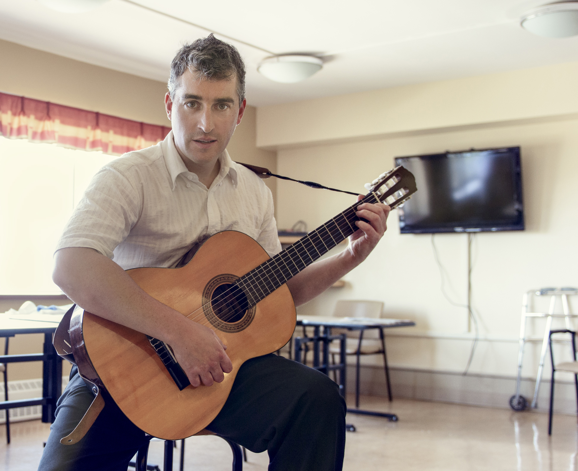 Armé de sa guitare, Olivier Fafard fait vibrer la corde nostalgique des personnes âgées en leur chantant Donnez-moi des roses et All Shook Up.