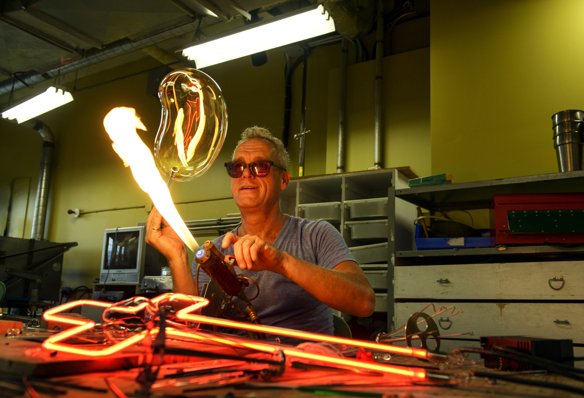 Le néon, ça se sépare en deux parties : une partie artistique – le travail du verre –, ça, c’est 90 % de la job; et une partie scientifique, pour que ça s’allume. Mais ça, c’est technique et c’est seulement 10 % du travail.