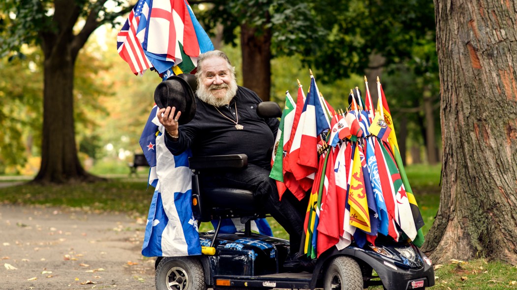 Pierre Delorme sillonne les rues de Montréal à bord de son quadriporteur bardé de drapeaux et armé de sa bonne humeur, un remède efficace contre ses nombreux bobos.