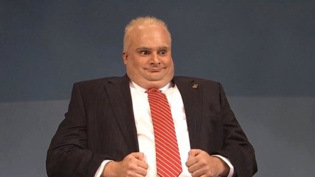 L’acteur américain Bobby Moynihan a enfilé son costume du maire dans un sketch parodiant les nombreuses excuses de Rob Ford pour avoir fumé du crack, payé pour de la drogue, conduit en état d’ébriété et emprunté un vocabulaire vulgaire en direct à la télévision.