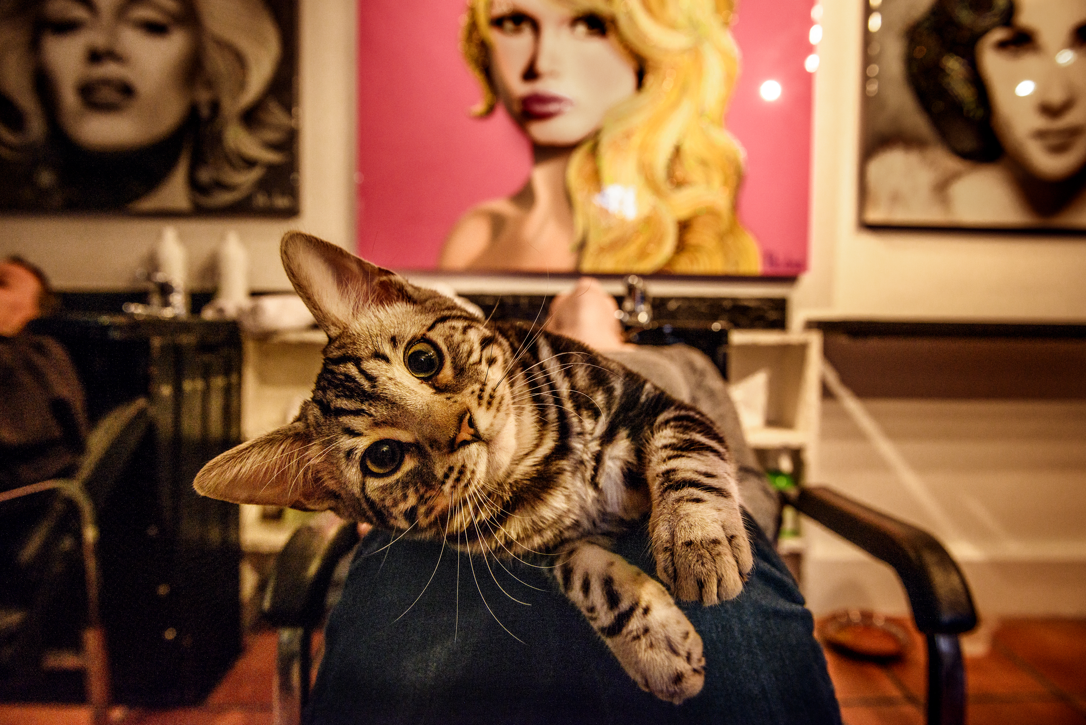 Non. Les deux ou trois clientes qui sont allergiques aux chats prennent un antihistaminique avant de venir. Sinon, la plupart des clients apprécient l’effet zoothérapeutique liée au fait de pouvoir caresser un chat en se faisant coiffer. Moov, notre petit Bengale silver marble, est le chat le plus doux sur terre. À Londres, à Paris et à Tokyo, les gens ont compris ça : il y a plein de cafés et de salons de thé où les chats se promènent en liberté.