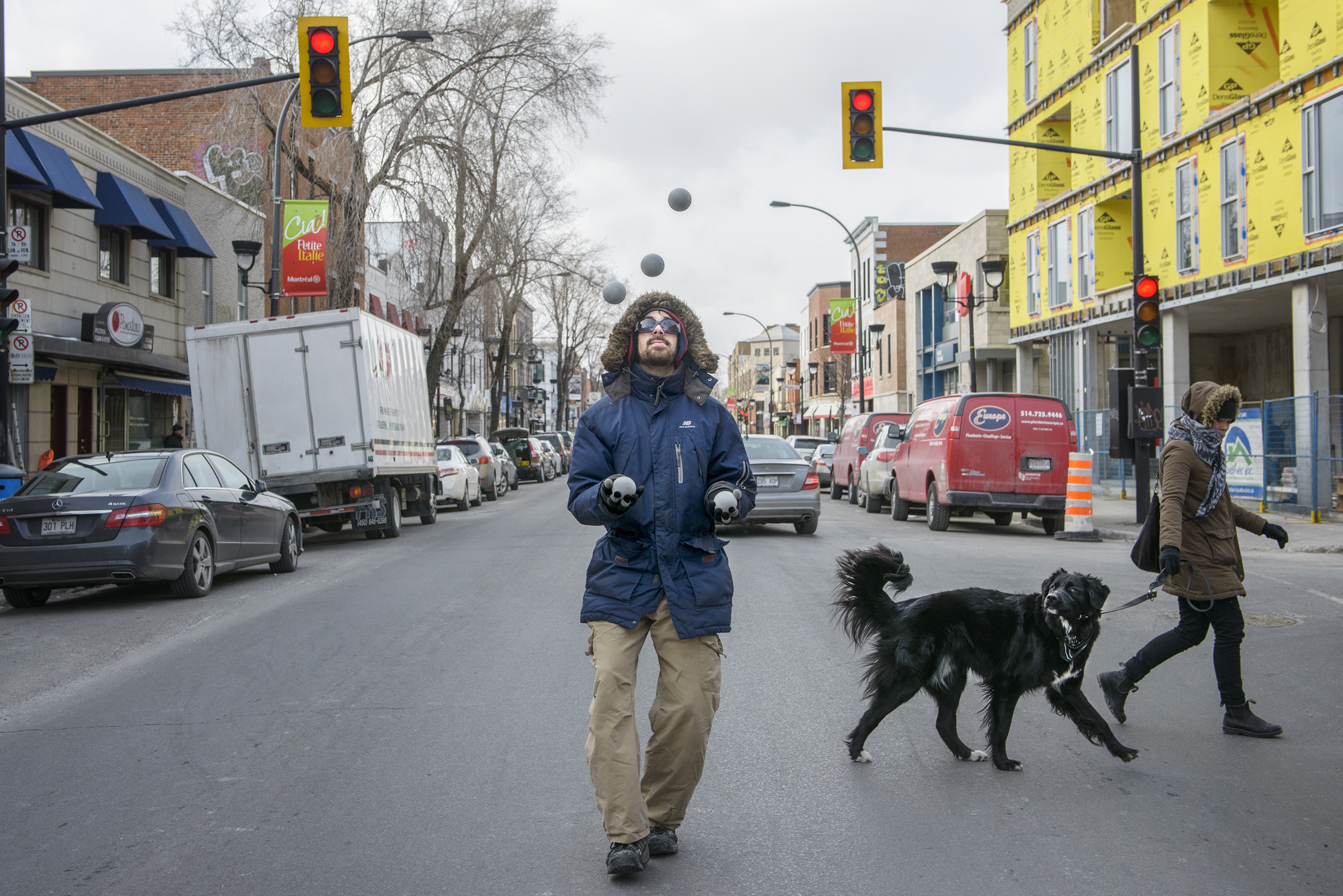 Nous avons croisé Nimo à son poste de travail habituel, au croisement de deux rues de la Petite Italie où, le temps d’un feu rouge, il divertit les automobilistes, été comme hiver.