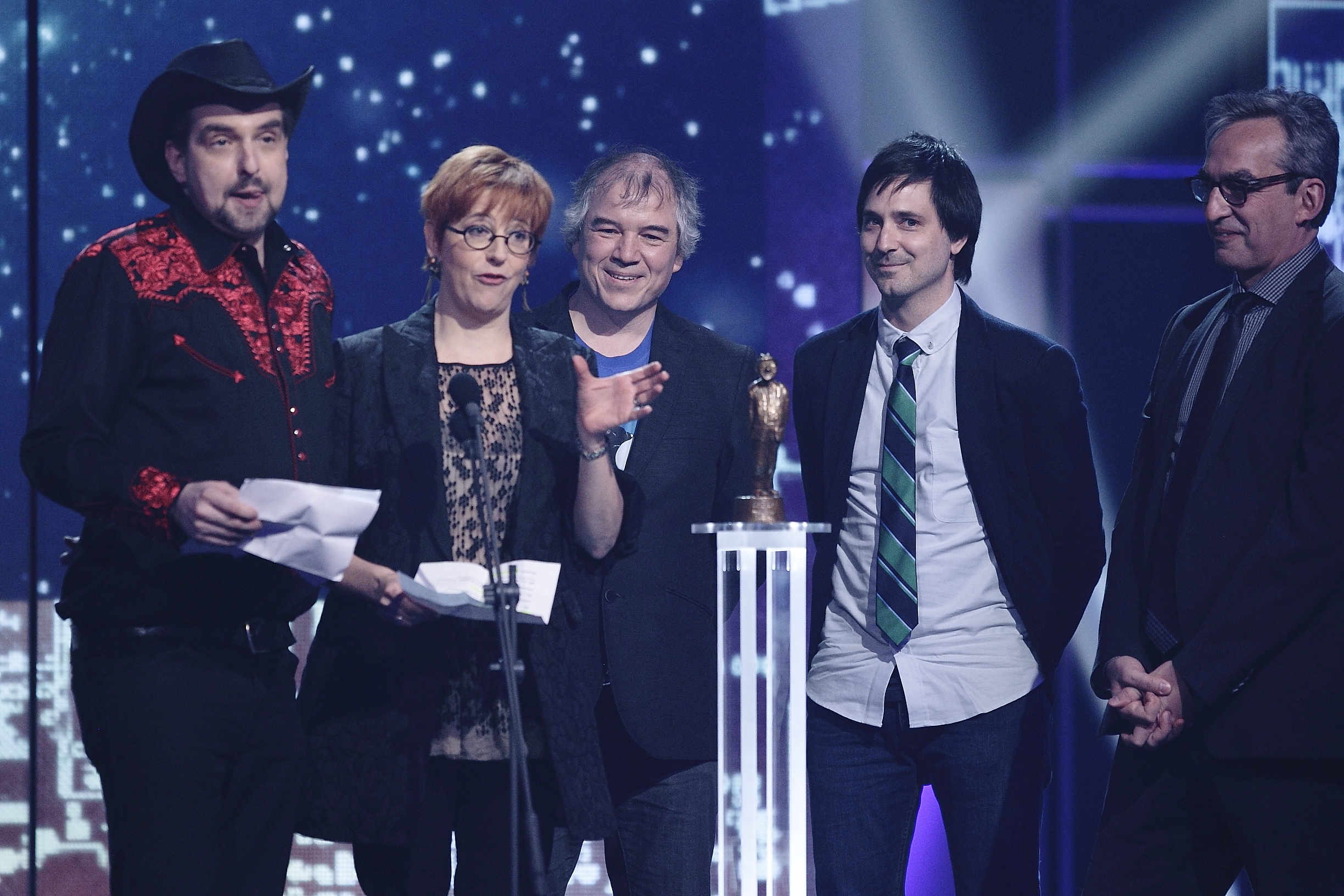 Sinon, André Sauvé, grand gagnant des prix de l’auteur et du spectacle d’humour de l’année pour Être, a offert des remerciements à son image. «Le processus créatif, c’est quelque chose qui me fascine», a-t-il souligné. Il a ensuite décrit le parcours que doit suivre une idée, «un flash», pour devenir un one-man-show. «Le flash qui doit trouver l’électricité, l’ampoule, l’abat-jour, la chaînette.» Il a aussi salué son équipe, rendant hommage à sa belle étrangeté. Comme son agent, Pierre Rivard, «qui ne parle pas les jours pairs». Notons que la metteure en scène de son spectacle, Josée Fortier, une des rares femmes à être montées sur scène pour recevoir une statuette hier, est repartie avec un prix pour son travail.