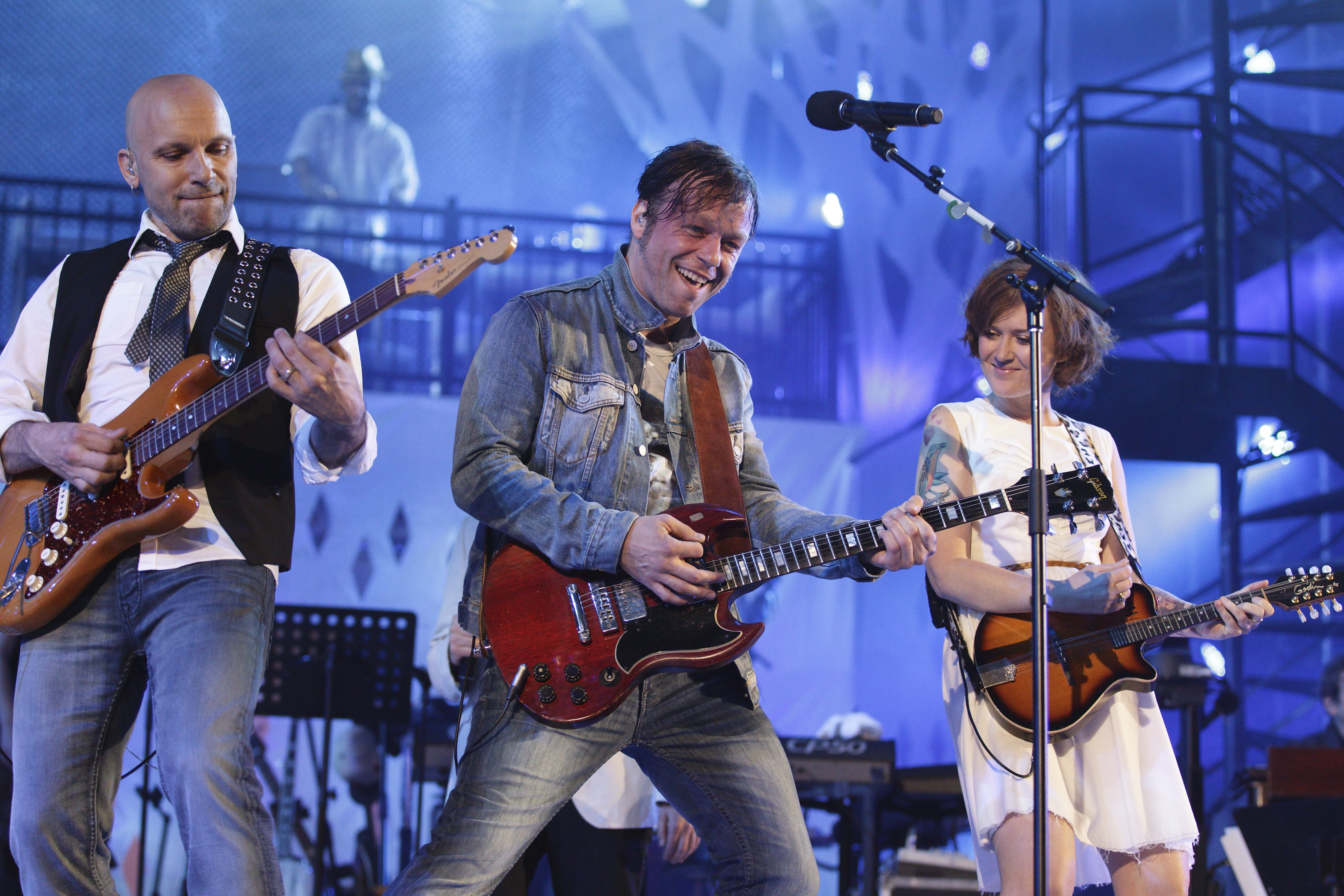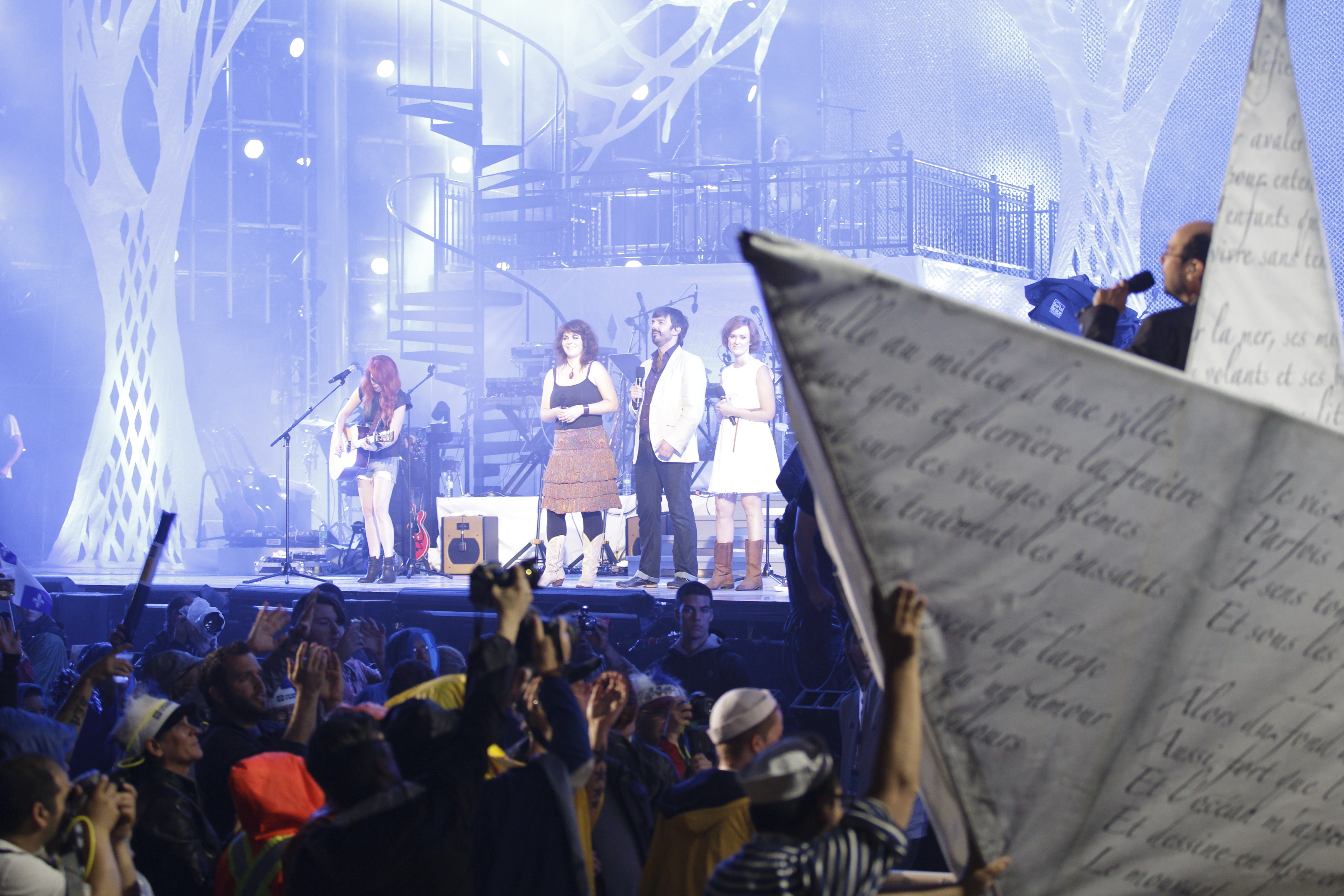 Dans ce concept «tout étoile», les artistes présents (Pierre Flynn, Daniel Boucher, Damien Robitaille, Michel Rivard, Mara Tremblay, France d’Amour, Misteur Valaire et Lisa LeBlanc ainsi que Boogat et Cœur de pirate comme «invités» un peu moins présents), tous sur scène sans interruption, participaient à tour de rôle aux chansons des autres. Ils y chantaient les chœurs, jouaient de leurs instruments et assuraient une présence énergique et empreinte de camaraderie. Damien Robitaille qui se joint à France d’Amour dans J’entends ta voix, les gars de Misteur Valaire dansant dans les marches derrière Damien Robitaille pendant Plein d’amour… Une belle idée rassembleuse qui a permis de tisser un lien tout au long de la soirée.
