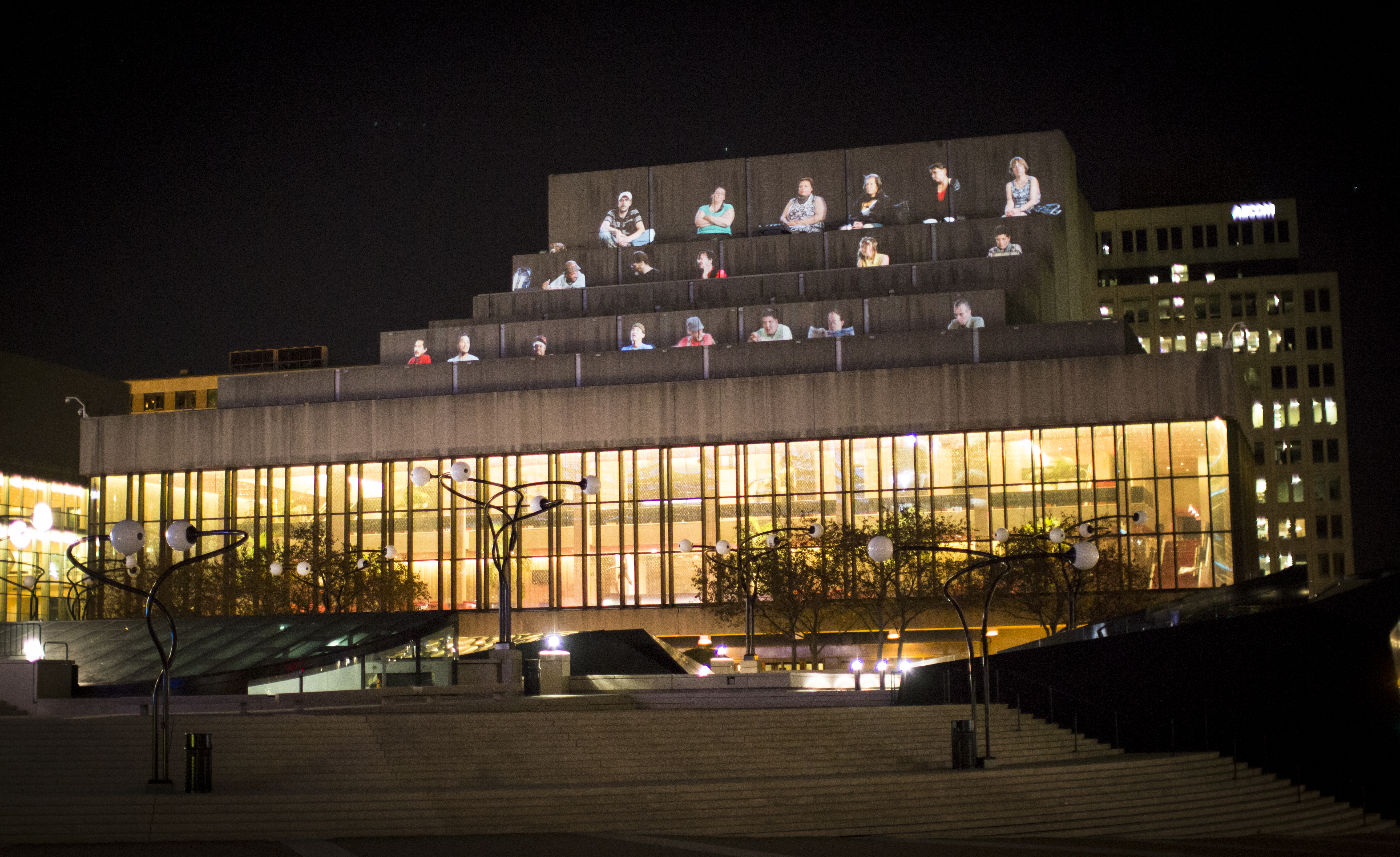 Pour cette œuvre créée dans le cadre de la Biennale de Montréal qui débute le 22 octobre, l’artiste a réalisé des entrevues avec une vingtaine d’itinérants découverts à l’Église au toit rouge, un organisme du quartier qui offre des repas aux sans-abri. Les images sont ensuite projetées sur la façade du théâtre qui n’est pas sans rappeler les gradins d’un hémicycle.