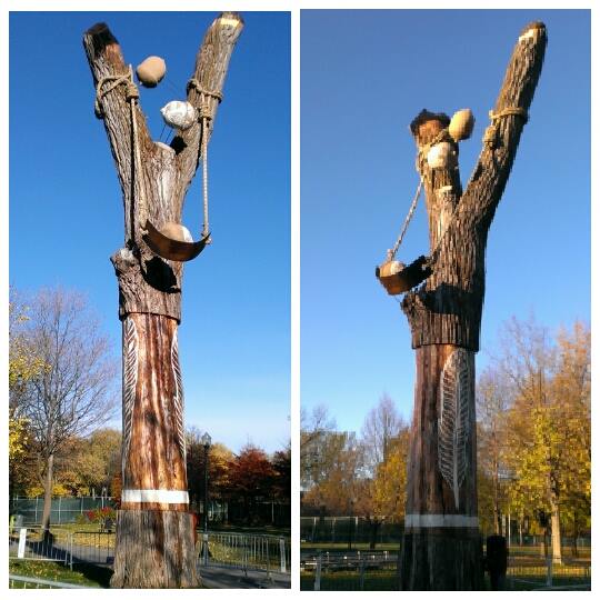 Le canevas de base de l’appel d’offres était un peuplier mort de 15 mètres. La forme de lance-pierres de l’oeuvre allait de soi pour eux en raison de la forme de V de l’arbre décédé. Les glands de chêne symbolisant la naissance de nouveaux arbres ont été faits à l’aide de styromousse, puis recouverts de fibre de verre et enfin teints. Les créateurs ont utilisé de la corde de paquebot pour représenter l’élastique et assurer une pérennité à l’oeuvre.