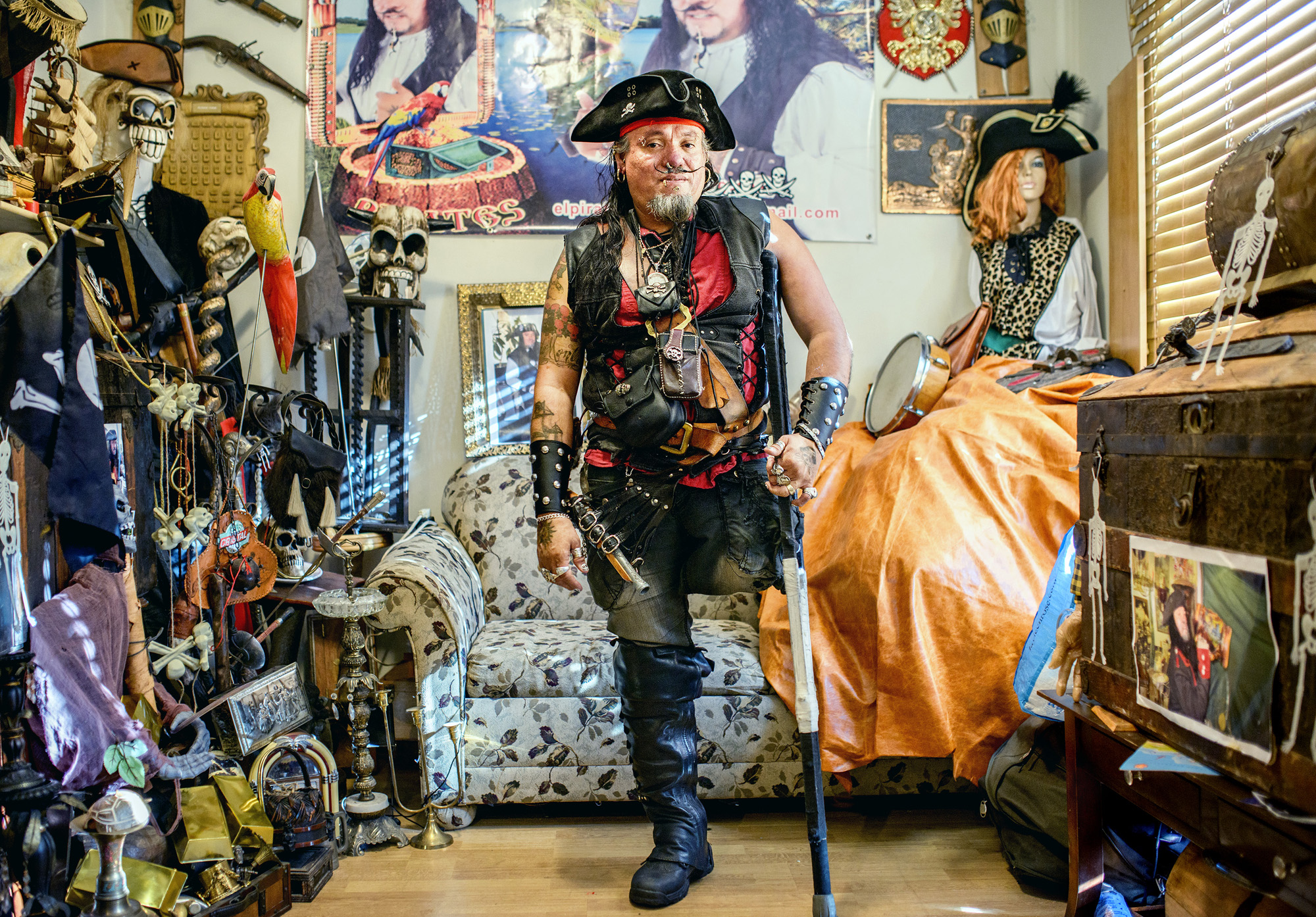 J’ai commencé il y a 20 ans à me déguiser en pirate pour l’Halloween. Les gens trouvaient mes costumes très originaux. Une fois, même, je me suis fait une vraie jambe de bois. Et depuis sept ans, je m’habille en pirate tous les jours. Je fais tout en pirate. Ça fait partie de qui je suis.