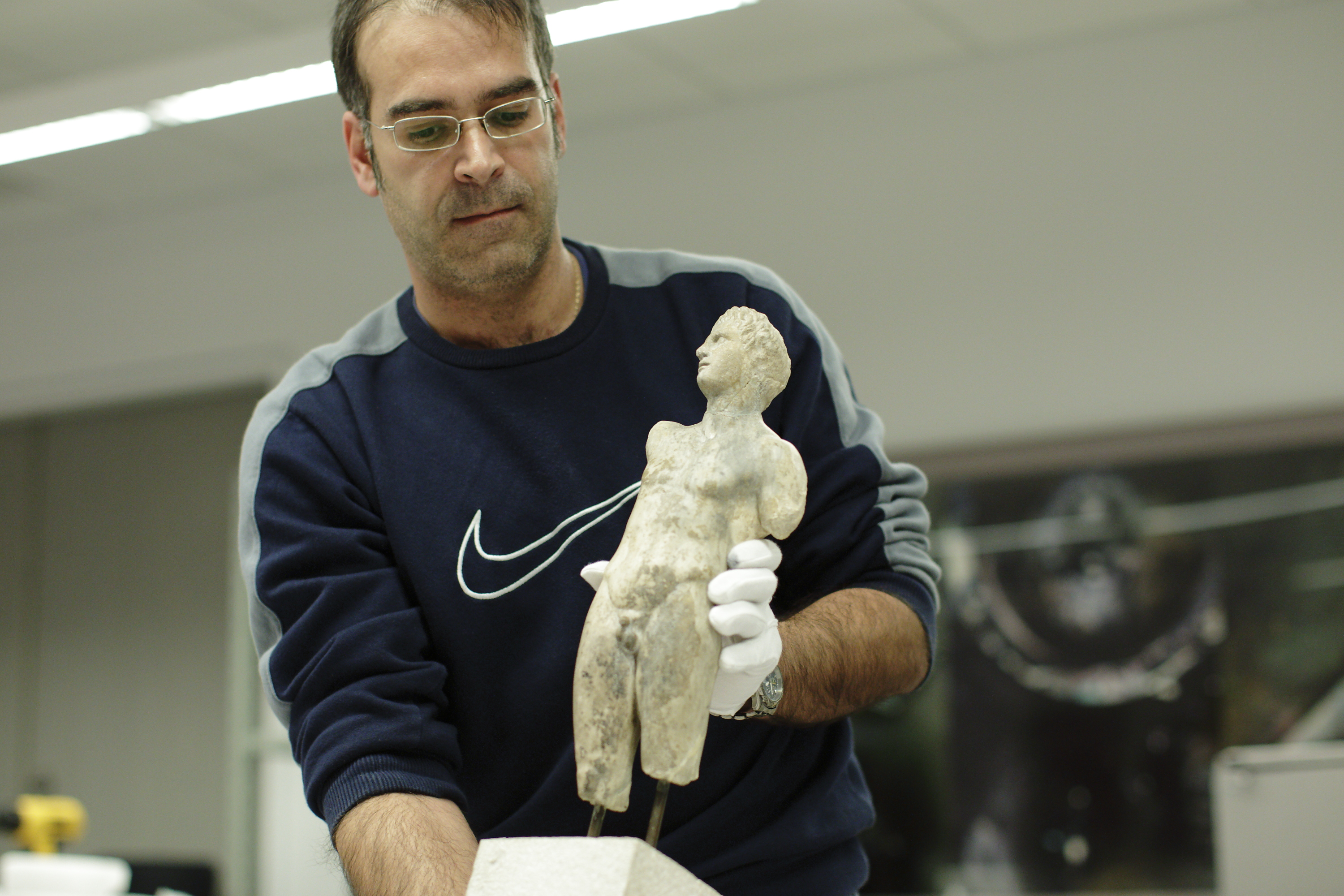 Un homme portant ce qu’on devine être un chandail-hommage à Niké, la déesse grecque de la Victoire, sort de sa boîte une statue de marbre représentant Alexandre le Grand. L’œuvre est arrivée à Montréal directement de Pella. /Yves Provencher/Métro