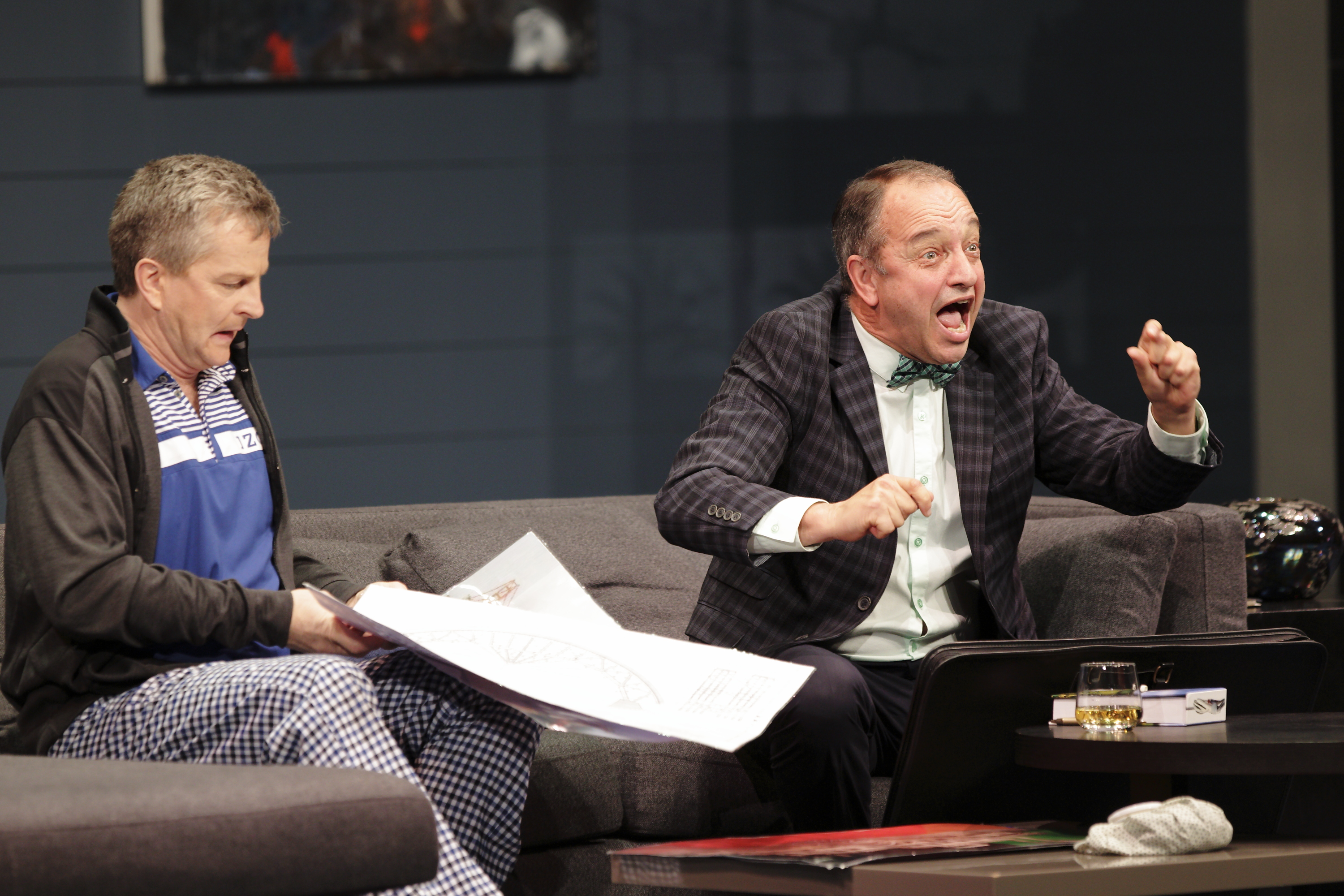 Pourtant, les premières séquences – une vidéo d’introduction assez inutile montrant sur un terrain de golf la bande de copains qui organisent les fameux «dîners de cons», puis une entrée en mode «slapstick» du Pierre Brochant (André Robitaille) au dos en compote, suivie enfin d’une discussion avec sa femme (Geneviève Rochette) dans un parler à mi-chemin entre le québécois et le français – nous ont fait grincer des dents et fait craindre le pire.