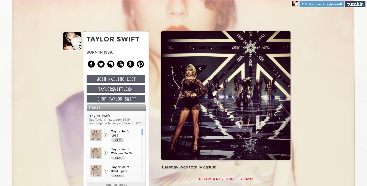 Au sommet du classement, Taylor Swift et son « taylorswift.tumblr.com » profitent d’une année pleine de succès, couronnée par la sortie de l’album et de la tournée « 1989 ».