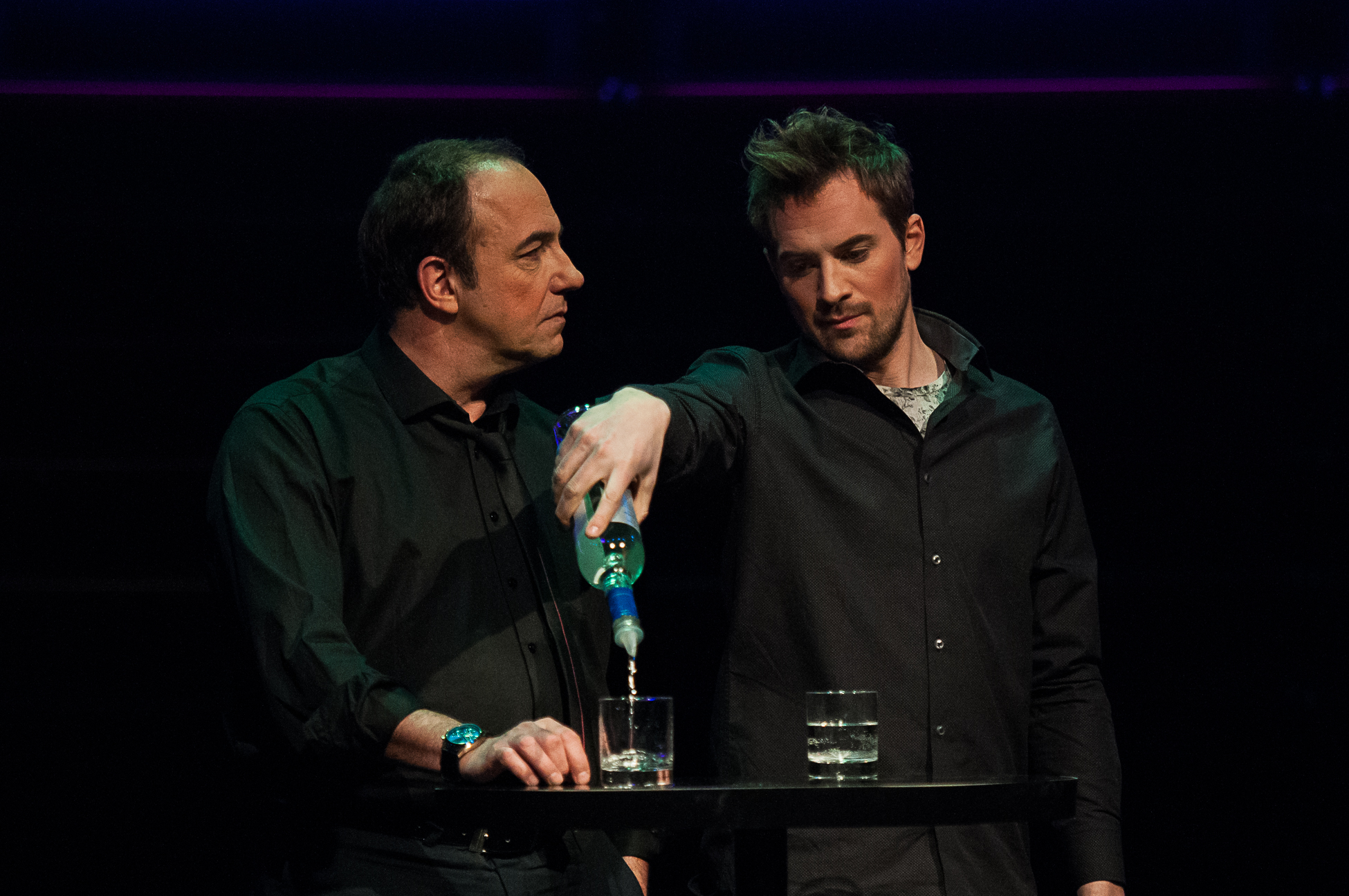 Sur le plateau de Roy, les invités viennent pleurer «les larmes de l’habitude d’exister», en buvant une boisson gazeuse («Oh! De l’eau déguisée!») le temps de répondre à une question qui trucide, de parler de leur voyage pseudo existentiel (d’une semaine) en Afrique et de s’humilier un brin. Avec son complet bien pressé, ses pantalons remontés et ses bas ostensiblement rayés, l’habile intervieweur prête une oreille attentive à ces «stars» vivant leurs six minutes de gloire, avide d’attirer la confidence-vide déguisée en confidence-choc. Mise en scène par Claude Poissant, la Grande écoute de Larry Tremblay se déploie, froide et mordante, comme ces dents qu’on montre à la télé. Regardez-moi! Je souris! Allez! Regardez! Grande écoute est présentée jusqu’au 21 mars à l’Espace GO. (Natalia Wysocka)